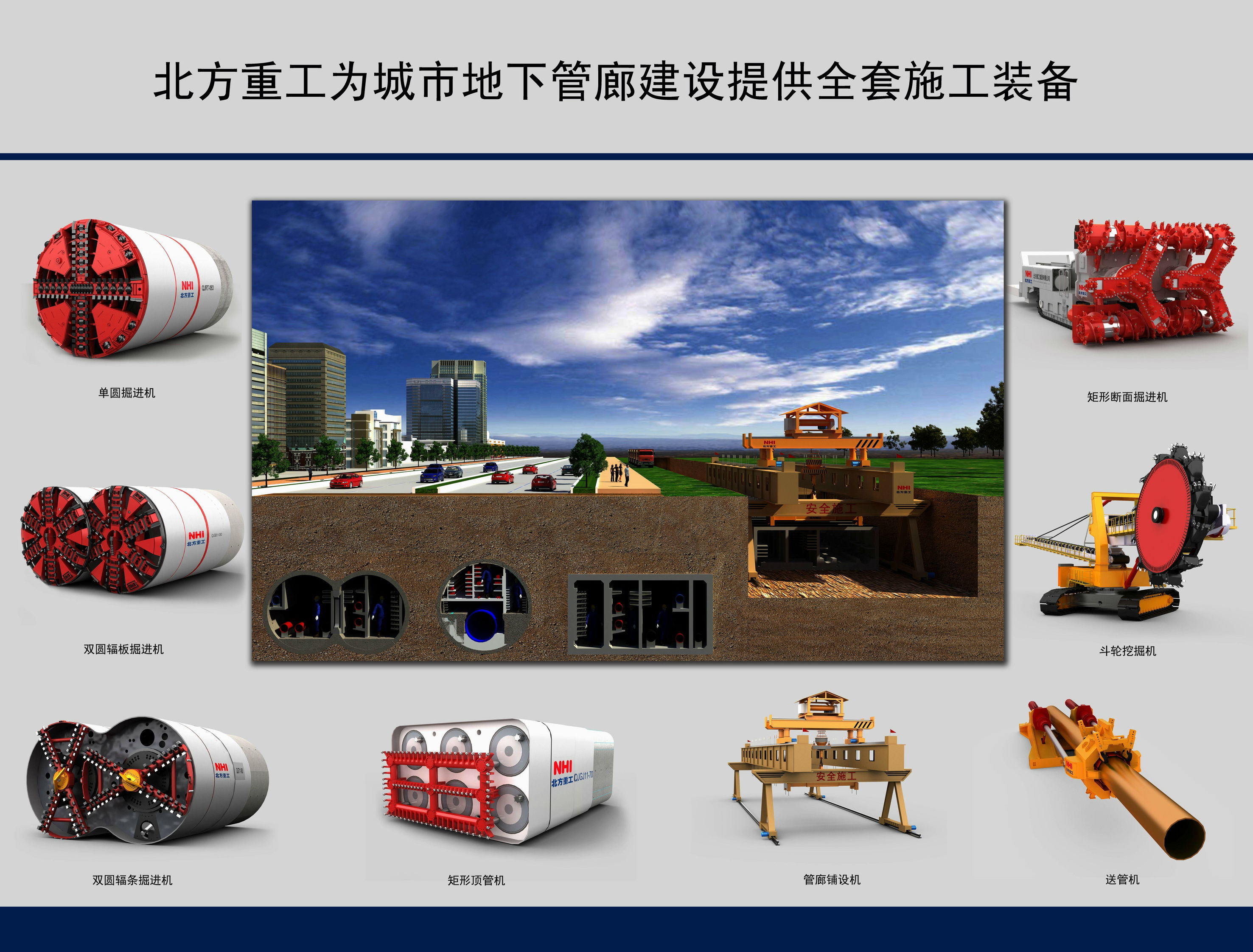北方重工擁有全套管廊建設(shè)施工裝備解決方案,技術(shù)全面,設(shè)備精良。明挖設(shè)備有矩形斷面掘進機和斗輪挖掘機。暗挖設(shè)備有單圓掘進機、雙圓掘進機和矩形頂管機。明挖輔助設(shè)備有送管機和管廊鋪設(shè)機等。