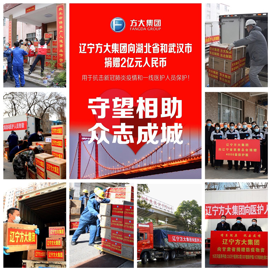 1月28日,遼寧方大集團(tuán)向湖北省和武漢市捐贈(zèng)2億元人民幣;2月2日、9日,方大群眾醫(yī)院重癥醫(yī)學(xué)科護(hù)士胡楠楠和曹寧,醫(yī)院醫(yī)生劉兆崇及護(hù)士李春、曹露、徐曉萌、萬(wàn)佳彤兩批共7名醫(yī)護(hù)人員參加遼寧省馳援湖北醫(yī)療隊(duì),走上抗疫第一線;2月10日,方大集團(tuán)再次向湖北省和武漢市捐贈(zèng)當(dāng)前急需的防護(hù)服2萬(wàn)套;2月7日,方大集團(tuán)向家鄉(xiāng)沈陽(yáng)捐贈(zèng)急需醫(yī)用防護(hù)服;2月14日,方大集團(tuán)通過(guò)沈陽(yáng)市紅十字會(huì)向沈陽(yáng)醫(yī)護(hù)人員無(wú)償捐贈(zèng)26.5萬(wàn)只醫(yī)用外科手套;2月16日,方大集團(tuán)從加拿大緊急采購(gòu)的3500套防護(hù)服和14950雙防護(hù)靴在運(yùn)抵沈陽(yáng)后,第一時(shí)間捐贈(zèng)給遼寧省紅十字會(huì),同時(shí)捐贈(zèng)的還有30000只醫(yī)用手套;2月17日,方大集團(tuán)馳援江西10萬(wàn)瓶維生素C片、5萬(wàn)瓶乙醇消毒劑和50萬(wàn)只醫(yī)用手套等防疫物資;2月19日,又通過(guò)甘肅省紅十字會(huì)和蘭州市政府捐贈(zèng)了5萬(wàn)個(gè)醫(yī)用口罩、30萬(wàn)只防護(hù)手套、674套防護(hù)服和10萬(wàn)瓶維生素C防疫物資;2月24日,方大集團(tuán)再一次向家鄉(xiāng)沈陽(yáng)捐贈(zèng)23800套醫(yī)用防護(hù)服,這也是新冠肺炎疫情發(fā)生以來(lái)沈陽(yáng)市接受捐贈(zèng)數(shù)量最大、價(jià)值最高的一批防護(hù)服;2月25日,方大集團(tuán)又從境外采購(gòu)8000套防護(hù)服,通過(guò)遼寧省紅十字會(huì)和遼寧省慈善總會(huì)再一次捐贈(zèng)給了家鄉(xiāng)遼寧。